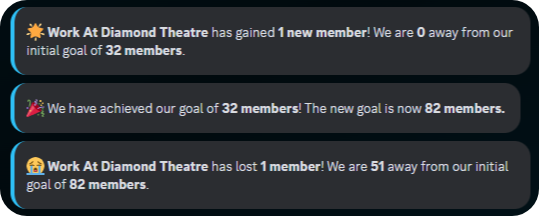 {goal}by the defined{increment}value (default: 50) and sends a goal achievement message. - Embed Option: Enable the